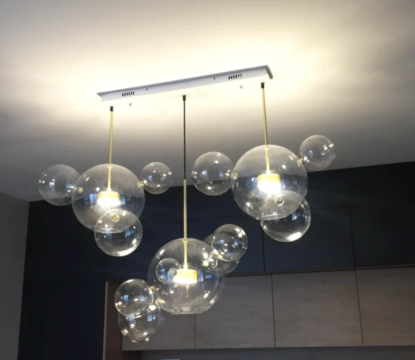 This variation of chandelier is the 3 Light 14 Glass Pendant manipulated to form a range of looks to suit each individual’s unique style and setting. Produced through the use of a blown glass technique called “a lume”, an expertise of the Venetian area, sophisticated and elegant, with a touch of the rich Venetian history. This blown glass method guarantees a highly precise glass structure, allowing the light to be assembled as delicate glass spheres with brass connectors. The bubbles are positioned in order to just touch each other, resembling a calming and tranquil cluster of bubbles. The central body of the lamp is finished in brushed aluminium in a brassy golden colour, while the light is emitted from the end of upside down “T” of its central body pole. This chandelier 3 Light is comprised of 14 various sizes of glass diffusers, all of which are clear transparent glass. The ceiling canopy is rectangle shaped and finished in matte white. The round or circular shaped 42cm diameter ceiling canopy is also available as a pre-order item only. Especially attractive in groups, perfectly suited as a polished and refined addition over the kitchen bench or a dining table. Other series of chandelier are 1 Light, 5 Light and 7 Light. To find out more about a particular designer lighting collection, series, custom length, style, colour, shape, size, or ETA, do not hesitate to send us an enquiry from our online contact page.