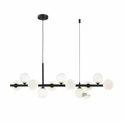 A striking reinterpretation of contemporary lighting, the Air Vine Black Linear Horizontal Pendant Chandelier elevates the concept of multi-light design with a bold new silhouette. The 11 multi-light pendant stretches across space with sculptural intent—an elegant fusion of structure and artistry that enhances any modern interior. This stunning pendant feature white opal glass diffusers mounted on a matte black steel frame, offering a high-contrast visual statement. The diffusers are arranged in a dynamic, seemingly random pattern across its axis, evoking the appearance of molecular bonds or a string of luminous beads. The result is a uniquely avant-garde piece that balances industrial edge with refined minimalism. It suspended via stainless steel cables and a flexible cord from a ceiling rose, it is more than a source of light—it’s a sculptural focal point. The opal glass diffusers emit a soft, ambient glow, ideal for creating an atmosphere in dining rooms, living areas, or entry spaces. Other similar style of linear pendants are Six Cule, Planetary Orb Chandelier, Ivy 4 Pendant and many more. For those with specific design needs, we offer custom-made light fittings tailored to your next grand project. Our expert craftsman can work closely with you to create a bespoke chandelier that perfectly complements your space and reflects your style.