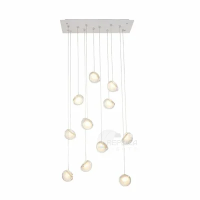 Series 76.11 Glass Chandelier Pendant Light for stairwell is created by utilising the latest modern vacuum glass technique. The end results are clear glass with black mineral mesh visual effect. The vacuum glass technique causes the initial layer to separate from embedded black mesh, almost like a division of dome growing cells cocooned inside a thin space. This fitting is consisting of 11 glasses with the choice of rectangular or square white ceiling canopy. All the eleven glasses are hung at different drop length by coax cables, the last glass can be as low as 3.5m from the ceiling canopy, longer drop available on custom pre-order. Other collections from Bocci 76 series are 1 Light Pendant, 3 Light Chandelier, 5 Light Chandelier, 7 Light Chandelier and 76s wall sconce. This contemporary glass chandelier will suit any small or large commercial application. It is also well suited for high ceiling application in a residential setting. If you are not able to find a particular designer chandelier or any other lighting product in our online store, or if you would like a custom colour, shape or size, please do not hesitate to send us an online enquiry from our contact page.