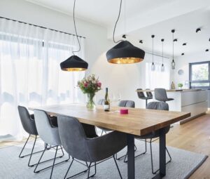 The idea of absolute precision has given way to personality. Perfect symmetry may still have its place in classic interiors, but today’s dining spaces often crave something more expressive—lighting that complements how the room is truly lived in. Rather than fixating on the midpoint of the ceiling, designers now see light as a tool to shape atmosphere and highlight activity. For example, a slightly off-centre pendant or chandelier that hugs the ceiling can add intrigue, or a cluster of smaller pendants can create rhythm and movement. These subtle imbalances make a room feel more natural, as if it has evolved over time rather than being staged for a photograph. When lighting reflects life, it feels authentic. A family gathered for dinner doesn’t sit in geometric precision—conversations flow, laughter bounces, chairs shift—and the lighting should embrace that same organic energy.